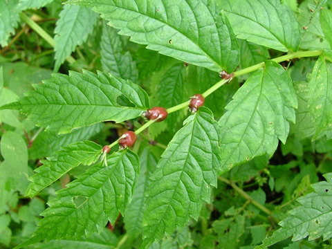 「みず」は、夏から秋にかけて葉の付けのところに実をつけます。これを「みずの実」とよんで、 葉や茎以上に重宝する食材となります。シーズンになるとこの「みずの実」採りが盛んになります。 沢伝いに葉の先をちぎりながら採取します。「みずの実」は、時期が来ると 葉から崩れるように落ちていきます。地方によってはこの「みずの実」を食べないところがあります。 「みずの実」を採取後、枝から「実」だけを残して葉を丁寧にとります。 「みずの実」は、さっとかるくゆでてそのまま生姜醤油でたべたり、漬けたりしますが、 なんといっても「みずの実」をベースにつくった「珍味漬け」は美味しく、当地方の名産となっています