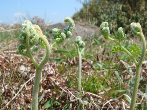 ワラビの若芽は小さな握りこぶしが数個ついたような形をしています。わらび独特のぬめりがおいしいんです!