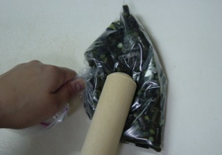 まな板にわらびをのせ、すりこぎで叩き、包丁で繊維を短く切ります。ビニール袋に入れ、すりこぎで叩くとラクですよ。
