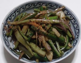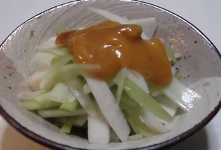 茎の皮をむき下処理した天然やまうどに酢味噌をかけて出来上がり!!