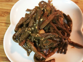 ぜんまいはザルにあけ、水で洗い、熱湯で2?3分ゆでてから水気をきって5?6cmの長さに切ります。(ゆでする時塩を入れる)